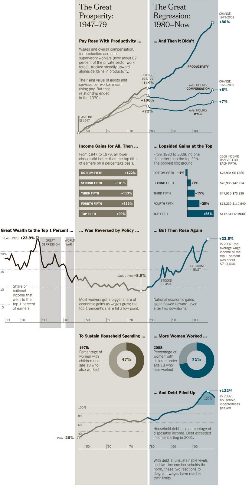 The underlying problem here is that his underlying suggestion that this is a process of _choice on the part of workers_, where they decide whether they are better off by taking the job with more pay and shittier work conditions, or with less pay and better work conditions – is incredibly naive. Adapting Marx, human beings make job choices – but not in circumstances of their choosing. This isn’t consumer choice in some idealized marketplace – it’s the product of an underlying political struggle. And it’s a political struggle that workers have been _losing_ over the last few decades. Even apart from rotten work conditions, the evidence on the changing distribution of the proceeds of cooperation within firms is emphatic.